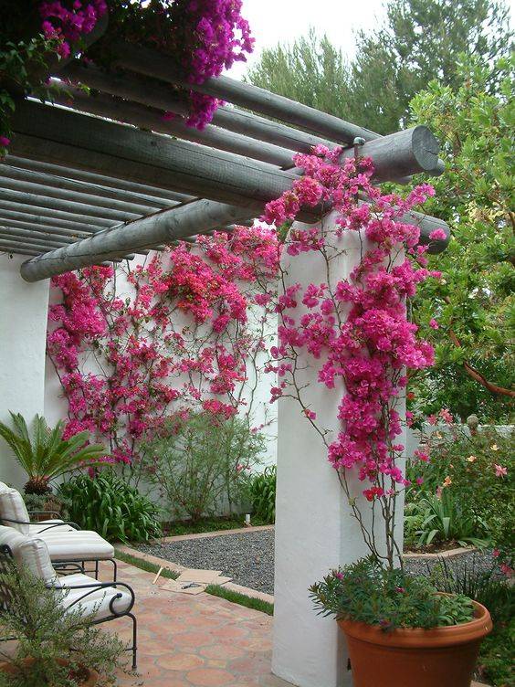 Bougainvillea “Pink Pixie” is a dwarf variety of bougainvillea that grows to a height of only 30cm to 40cm, making it perfect for small gardens, patios, and balconies. It produces vibrant pink flowers and lush green foliage. The plant is vigorous, evergreen or almost deciduous climber with stems bearing down-cruving thorns and ovate, downy, mid-green leaves, 10cm long. Purple or pink bracts, 5-6cm long, are produced from spring to summer. It is native to Brazil.